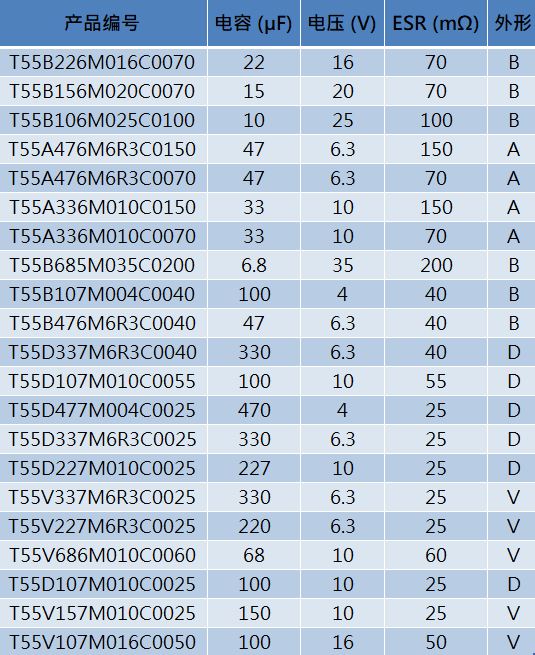 T55系列的外形尺寸为J、P、A、B、T(低高度B,最高1.2mm)、D和V,电容范围为3.3µF~470µF,电压等级从2.5V到25V,电容公差为±20%。器件在+25℃和100kHz下具有500mΩ到15mΩ的超低ESR,工作温度范围为-55℃~+105℃。