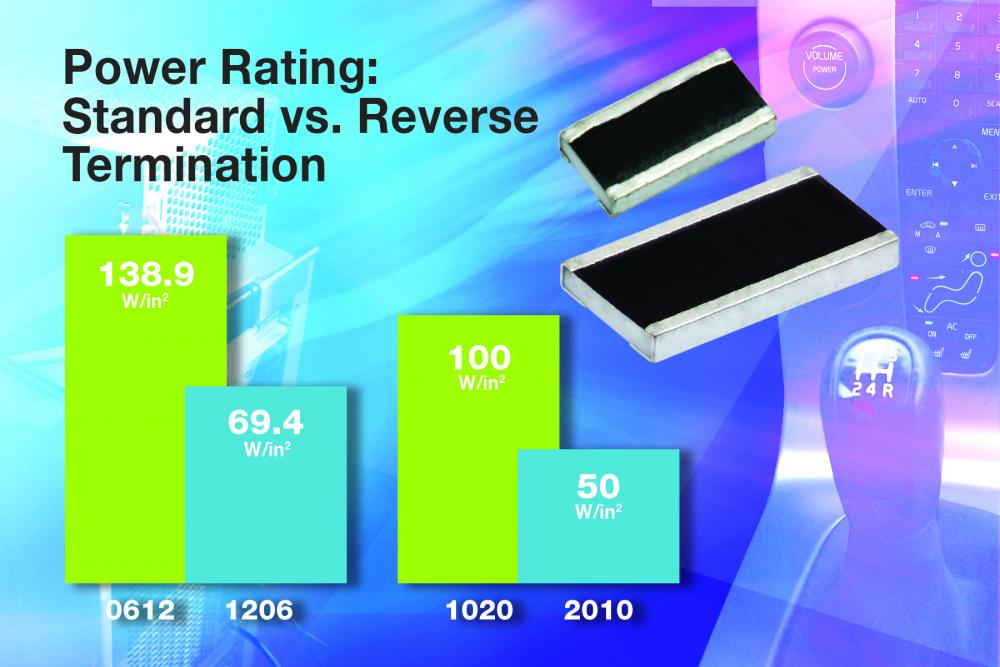RCWE0612和RCWE1020的长侧边端接使器件到PCB的散热路径更短,使其功率等级分别提高到1W和2W。另外,电阻的结构减小了与PCB不匹配的热膨胀系数(CTE),通过降低由热循环引发焊点开裂的可能性,提高可靠性。