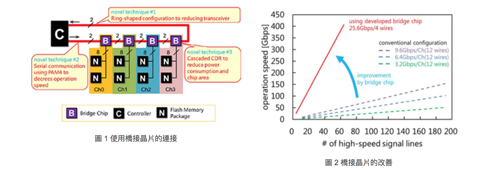 该公司利用可连接控制器和快闪记忆体芯片的桥接芯片 (图 1) 克服了这个问题,其中包含三种新技术:菊链*1 连接,以环状方式连接控制器和桥接芯片;采用 PAM 4*2 的序列通讯;以及抖动 (jitter)*3 改善技术,不再需要在桥接芯片使用 PLL 电路*4。凭借以上技术,能够减少桥接芯片的开销,而且仅需透过几条高速讯号线,就能高速运行大量的快闪记忆体芯片 (图 2)。